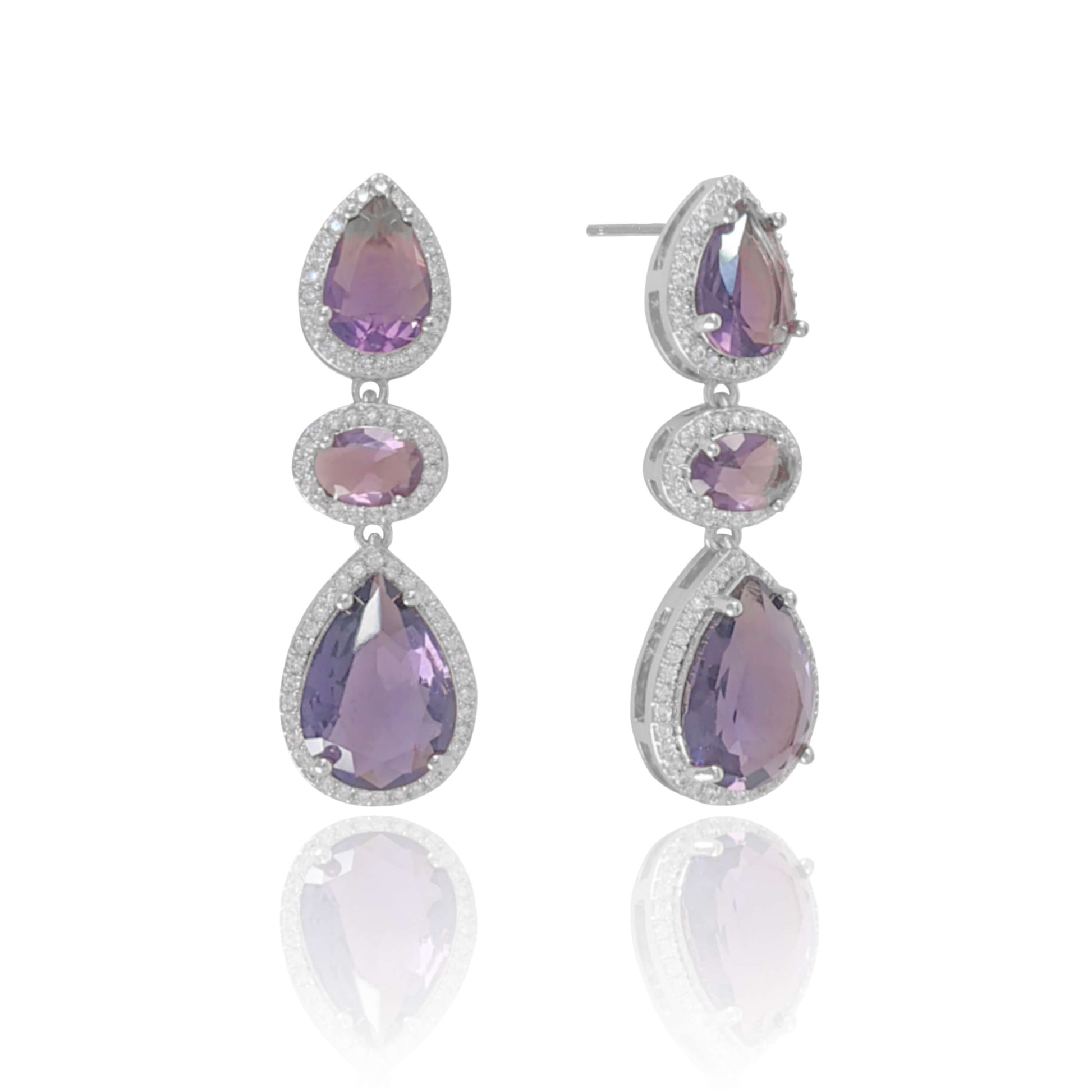 Brinco Gotas Oval Ametista Cravejado Zircônia Banho Branco